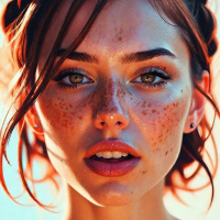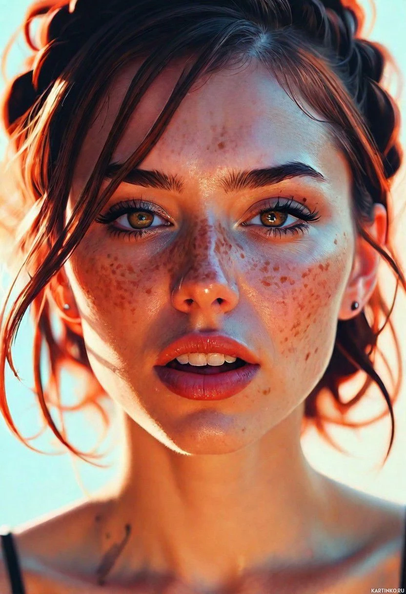 На картинке запечатлена молодая женщина с выразительным носом и глазами. Её волосы словно собраны в высокую причёску, а на коже заметны лёгкие веснушки. Щёки у неё румяные, губы слегка приоткрыты, словно она вот-вот заговорит или отреагирует на что-то. Фон мягко размыт, но создаёт ощущение теплого источника света, возможно, солнечного.