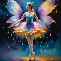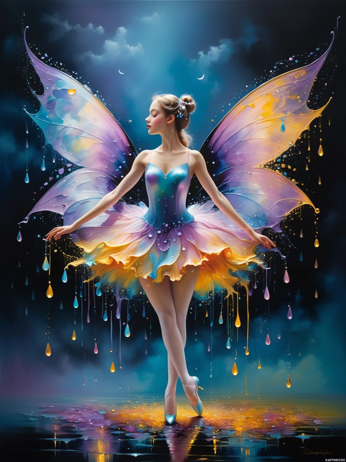 In the image, there is a woman who appears to be a ballerina. She has large, vibrant wings that resemble those of a fairy or angel, with