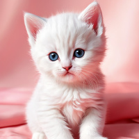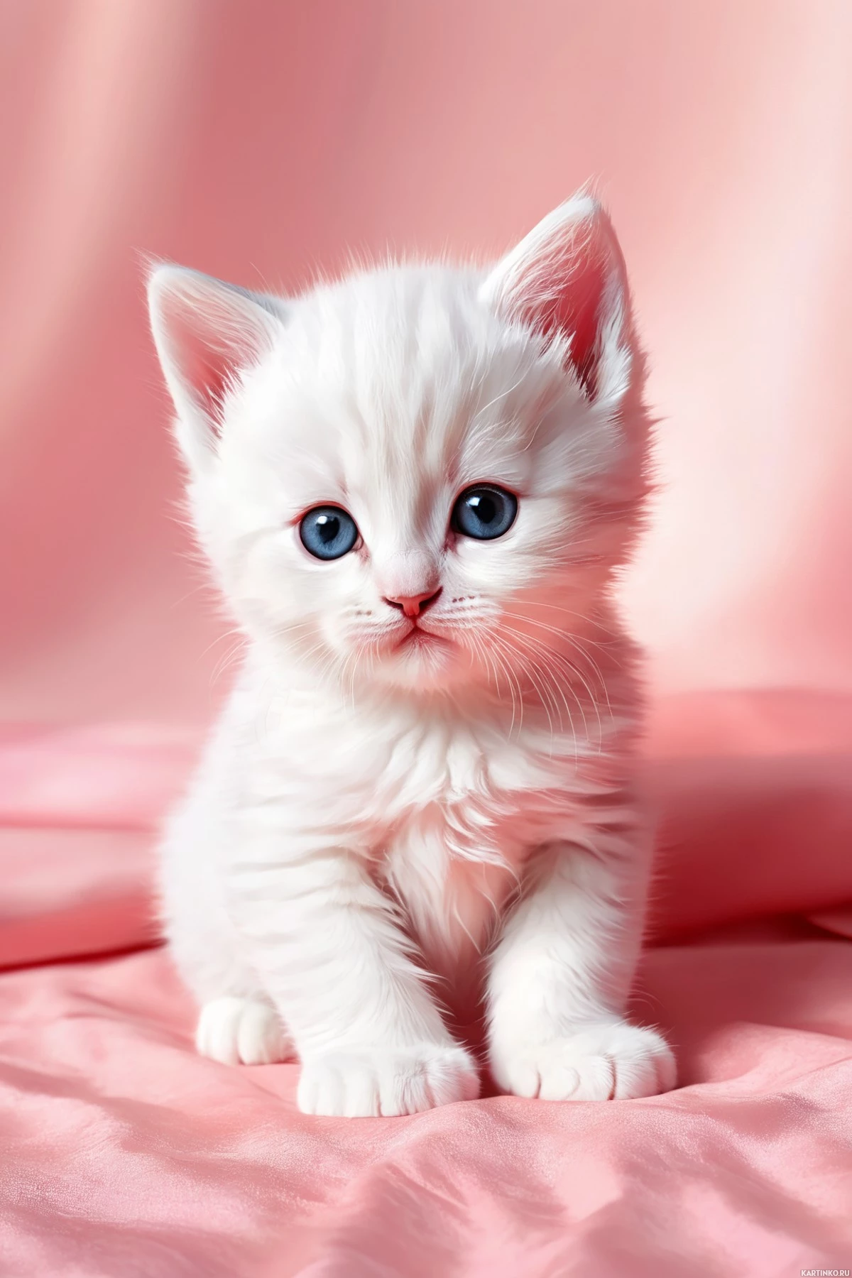blue eyes sitting on a soft, pink surface. The cat appears to be calm and is looking directly at the viewer. Its fur is fluffy and there's a hint of pink around its mouth area, suggesting that it might be related to the color of its environment or perhaps from feeding. The lighting in the image casts