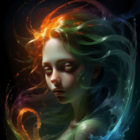 The image depicts a stylized digital artwork featuring a young woman with long, dark hair and green eyes. She has light skin and is wearing what appears to be a protective mask on her face, which includes a visor covering the lower part of her face. The mask has a white design that covers the nose and mouth area. Behind the girl's head, there is an abstract, fluid-like shape resembling a stylized wave or vortex with colors ranging from blue to green to red. This shape suggests motion or energy surrounding her. Her expression is neutral, and she has a thoughtful or contemplative look on her face. The artwork has a dark background which contrasts with the vibrant colors of the girl and the abstract element. The style of the image combines elements of realism for the human figure with fantastical elements in the form of the colorful wave.