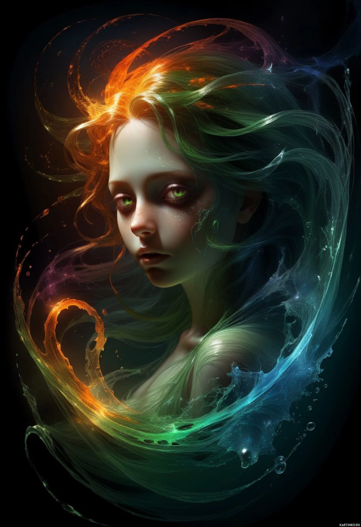 На картинке представлена стилизованная цифровая работа, на которой изображена молодая женщина с длинными темными волосами и зелеными глазами. У нее светлая кожа, и на лице у нее маска, включающая визор, закрывающий нижнюю часть лица. Маска украшена белым рисунком, покрывающим нос и рот. За головой девушки виден абстрактный, текучий элемент, похожий на стилизованную волну или воронку, с цветовой гаммой от синего до зеленого и красного. Этот элемент создает ощущение движения и энергии, окружающих ее. Выражение лица нейтральное, а взгляд задумчивый. На темном фоне особенно выделяются яркие цвета девушки и абстрактный элемент. Стиль картинки сочетает реалистичность в изображении фигуры человека с фантастическими элементами, воплощенными в яркой волне.