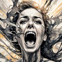The image depicts a stylized illustration of a female character with an expressive face and mouth open as if she's screaming or shouting. Her hair is flowing outward, giving the impression that her emotions are being expressed through the force of her voice. There appears to be a dark, textured element emerging from her neck area, which could suggest discomfort or distress. The background has a burst of colors and light effects, possibly indicating a dramatic or intense moment in the scene.