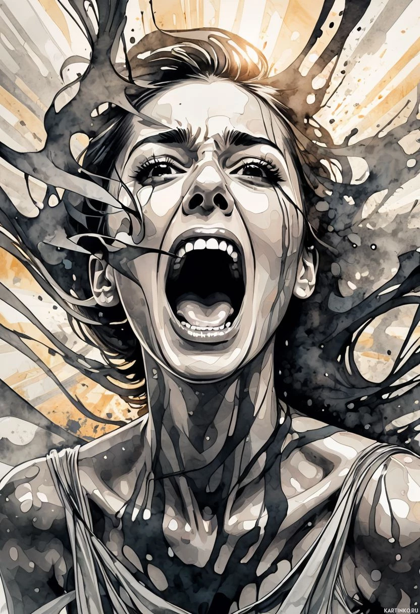 На картинке – стилизованная иллюстрация женщины с выразительным лицом и растертым ртом, как будто она кричит или возмущается. Её волосы развеваются, словно передают силу её голоса. Из области шеи, кажется, выступает темный, фактурный элемент, который может говорить о дискомфорте или переживаниях. Фон – всплеск красок и световых эффектов, возможно, передающий драматизм происходящего.