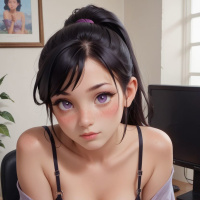A young woman with long dark hair, wearing a black lace bra and posing suggestively at a desk. She has a red lipstick on her lips.