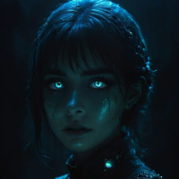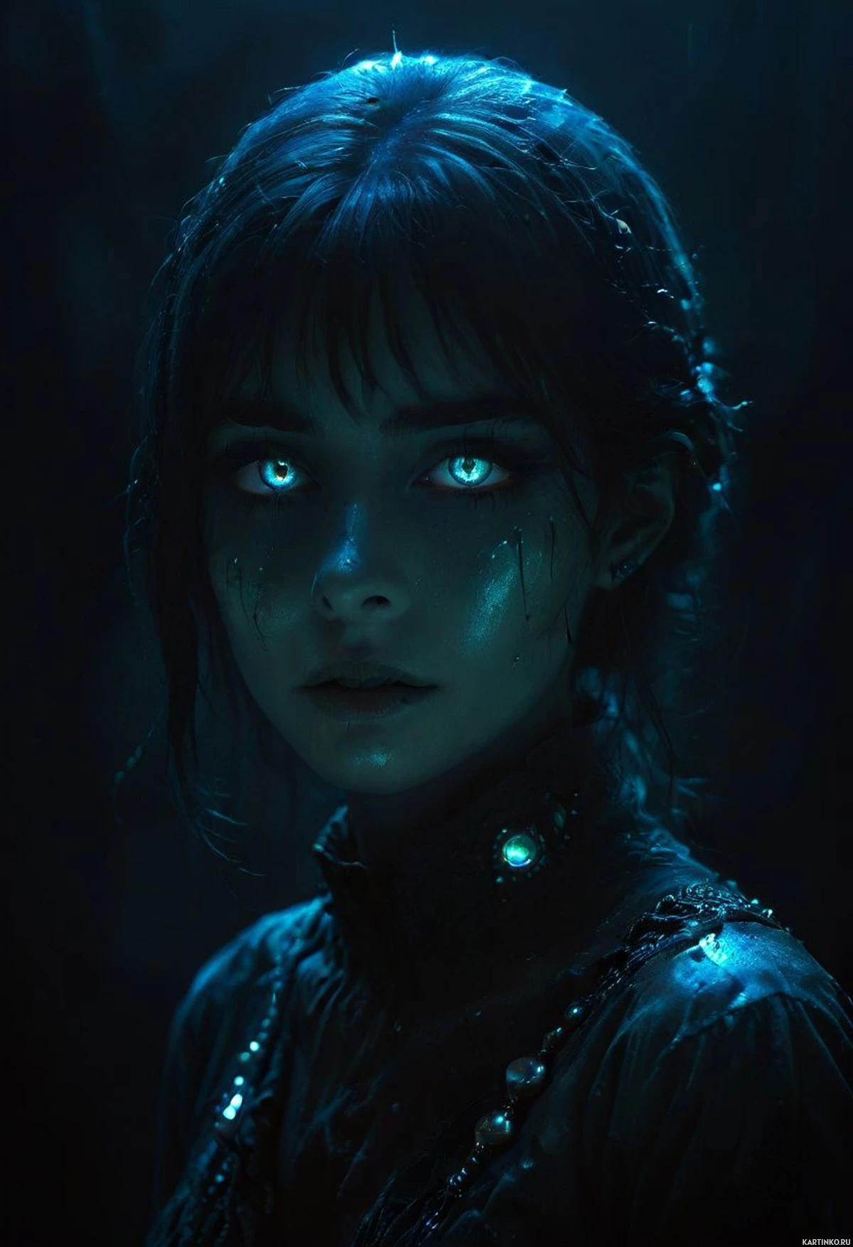 The image features a young woman with shoulder-length brown hair styled in an updo. Her skin appears pale, and she has blue eyes. She is wearing dark clothing that seems to have a textured or embellished design on the shoulders and chest area, as well as a dark garment that covers her torso. The lighting highlights her facial features with an ethereal glow.
