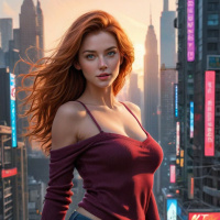 На картинке выделяется молодая женщина с яркими рыжими волосами. На её лице уверенная улыбка, а взгляд направлен прямо на зрителя. За её спиной – оживлённая городская улица на закате или в сумерках: высокие небоскрёбы, подсвеченные рекламные щиты и светофоры создают неповторимую атмосферу. Небо окрашено в оранжево-синие тона, что указывает на ранний вечер. Она одета в тёмный топ с прозрачными рукавами и светлые джинсовые шорты, что эффектно контрастирует с её огненно-рыжими волосами.