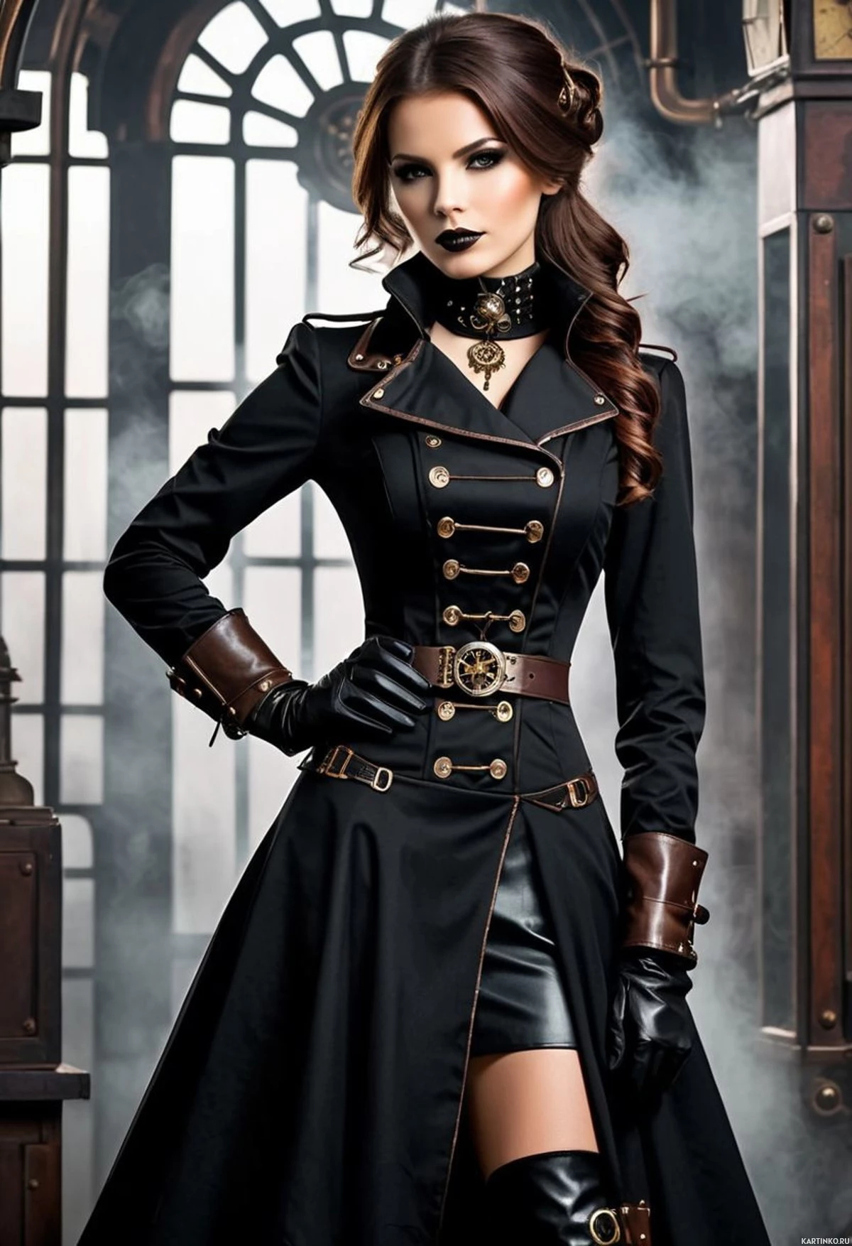 На картинке изображена женщина в черном пальто с декоративными пуговицами в стиле милитари, корсете, высоких сапогах с ремешками и перчатках. У нее рыжие волосы, собранные в сложную прическу, и темный макияж вокруг глаз. Ее поза выражает уверенность и напористость. На заднем плане — интерьер старинного здания, возможно, викторианский холл с деревянными панелями и арочными окнами, окутанными легкой дымкой.