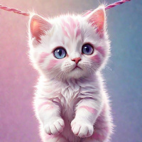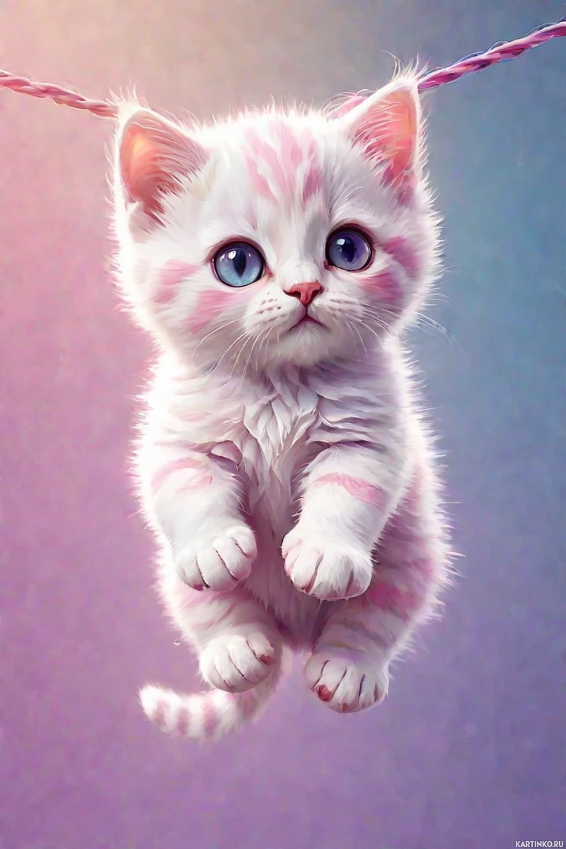 blue eyes. It appears to be floating in mid-air, holding onto what seems to be a string or ribbon with its