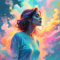 На картинке запечатлена молодая женщина с закрытыми глазами и задумчивым выражением лица. У неё короткие волосы с косой челкой. Кожа бледная, кажется, она слегка курит. На заднем плане – яркая сцена с разноцветными облаками или дымкой, сливающейся со звёздным небом. Цвета насыщенные, в них переливаются розовые, фиолетовые, оранжевые и синие оттенки, создающие атмосферу сказки или сна. На ней белая верхняя часть и темный низ.