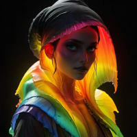 The image features a woman wearing what appears to be a costume that resembles a hooded cloak with a prominent rainbow-colored hood. She has striking blue eyes and is looking directly at the viewer. Her expression is neutral, and she has a light complexion. The overall style of the image suggests it could be from a video game or a stylized illustration.