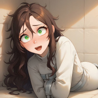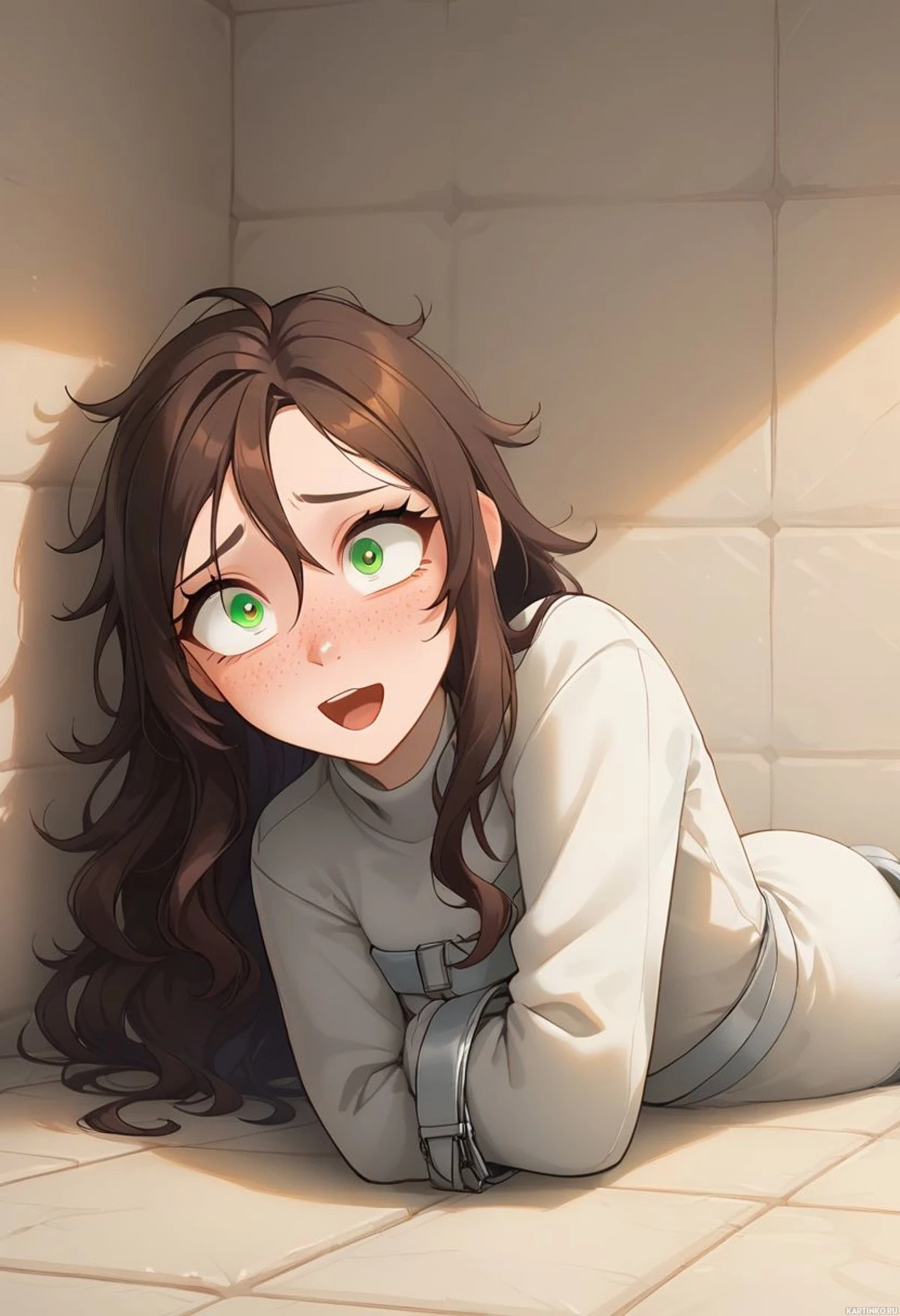 На картинке изображен стилизованный мультяшный персонаж – девочка, лежащая на животе с запрокинутой головой у стены. На ее лице выражение грусти или усталости, а щеки – румяные. У персонажа длинные каштановые волосы, и она одета в некий защитный костюм, что может указывать на декорации, например, подземелье или подобное место.