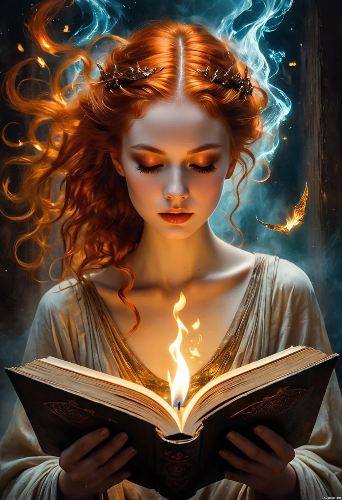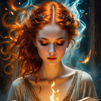 На картинке изображена девушка с рыжими волосами. Она с закрытыми глазами, словно сосредоточена на чем-то вне кадра. Ее волосы развеваются, создавая ощущение движения или ветра. На ней нарядный костюм, который можно интерпретировать как средневековый или фэнтезийный. В руках она держит открытую небольшую книгу, из которой вырываются языки пламени. Фон темный, похоже на полумрачный интерьер с деревянными панелями или стенами, что создает мистическую атмосферу картинки.