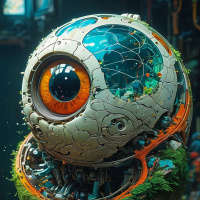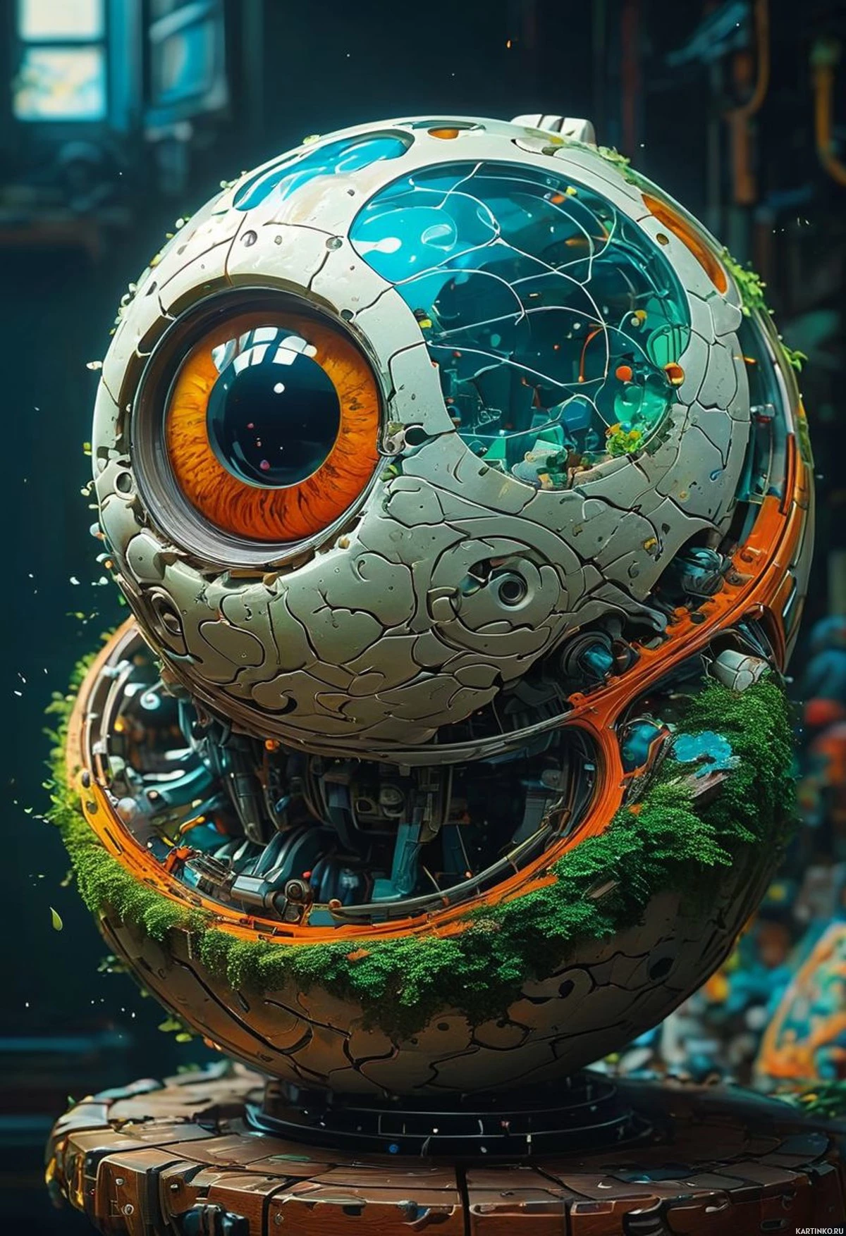 Картинка изображает механический объект, напоминающий глаз, с замысловатыми деталями. В центре находится блестящий, сферический чёрный глаз, встроенный в металлическую или роботизированную конструкцию, окружённую шестернями и трубками. Над этой сферой – потрескавшаяся, текстурированная поверхность, свидетельствующая о повреждениях или износе со временем. На этой треснувшей секции пробивается растительность: зелень и небольшие цветы, добавляющие нотку органичной жизни к иначе неодушевлённому объекту. Вокруг этого объекта, похожего на глаз, создаётся индустриальная атмосфера с видимыми на заднем плане трубами и машинами, что может указывать на научно-фантастический контекст. Освещение приглушённое, с тенями, подчёркивающими края объекта и акцентирующими его механическую природу. Цвета приглушённые, с преобладанием металлических оттенков.
