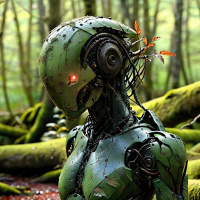 На картинке стоит робот на лесной полянке. Он словно собран из сочетания органических и механических деталей. У него металлическая голова и корпус зелёного цвета, видны шарниры и провода, намекающие на возможность движения. На груди – красный свет, исходящий из круглой области. Руки робота тоже металлические и слегка вытянуты, как будто он готов взаимодействовать с окружающей средой. Вокруг него — густой лес с высокими деревьями и толстыми стволами, а также подлесок из низких растений. Мох, покрывающий деревья и землю, говорит о том, что это место, вероятно, влажное или туманное. Цветовая гамма картинки приглушенная, преобладают зелёные и коричневые тона, что создает общую атмосферу сцены.