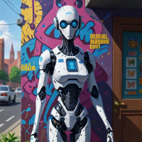 The image features a depiction of a robot against a colorful backdrop. The robot stands upright with its arms at its sides, and it is positioned in front of a wall with vibrant splashes of color, resembling an urban graffiti-style artwork. The focus of the photograph seems to be on the interaction between the robot figure and the decorated background, which could evoke themes related to science fiction or futuristic technology within a cityscape context.