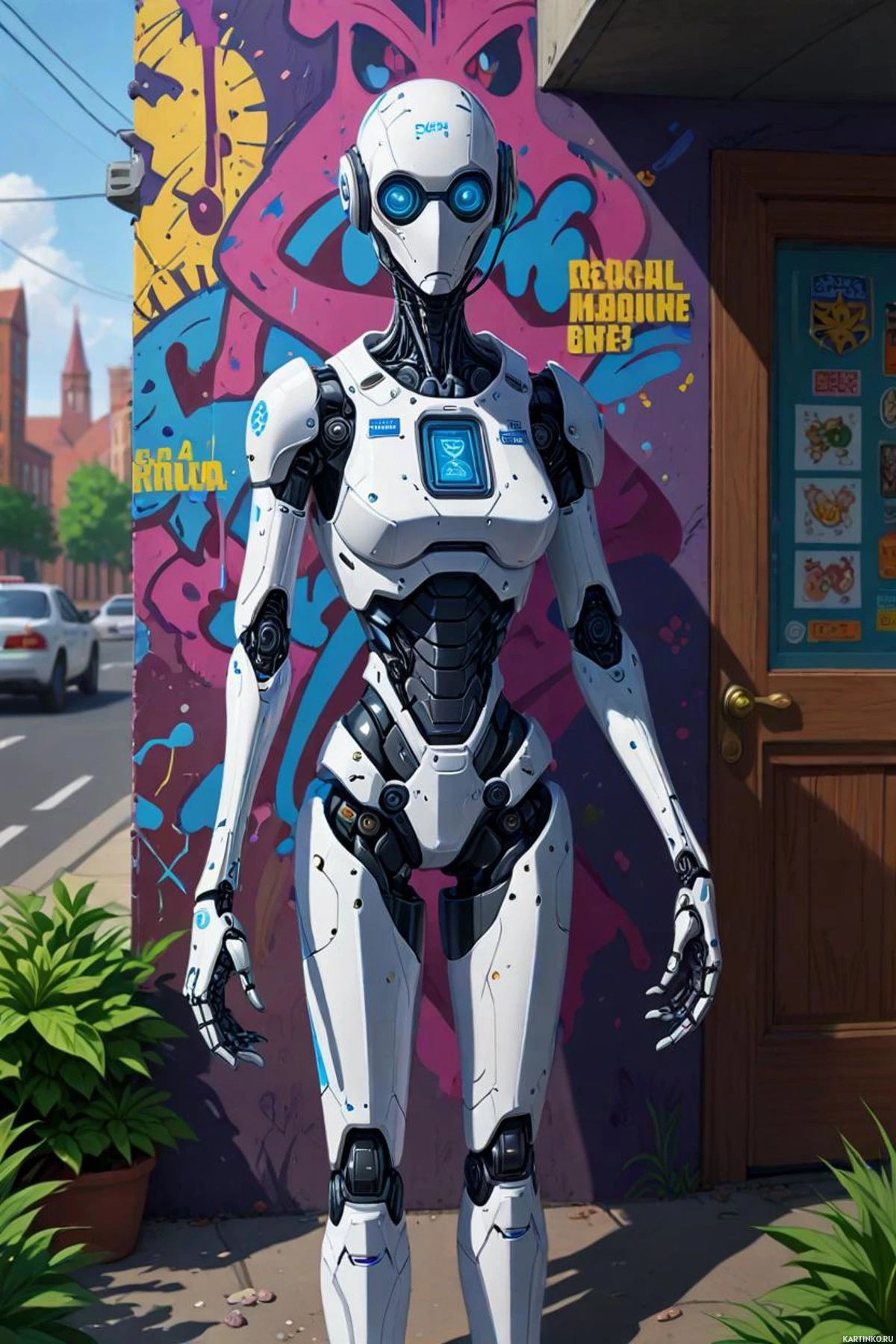 На картинке изображен робот на фоне ярких красок. Он стоит прямо, руки опущены по бокам, на фоне стены, украшенной взрывными пятнами цвета, напоминающими городскую графити-роспись. Фокус фотографии – взаимодействие фигуры робота и декоративного фона, что может отсылать к темам научной фантастики или футуристических технологий в городском пейзаже.
