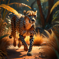 In this image, a cheetah is seen walking through an enchanted forest. The forest floor appears to be dirt with rocks scattered around. On the left side of the frame, there's a large fern, and on the right, there are trees that have a twisted trunk pattern. The foliage in the background exhibits a mix of green and brown hues, suggesting either late autumn or early spring colors. The cheetah is depicted mid-stride with its head turned to the left, giving an impression of alertness or curiosity about its surroundings. The overall atmosphere of the image suggests a serene yet vibrant natural setting.
