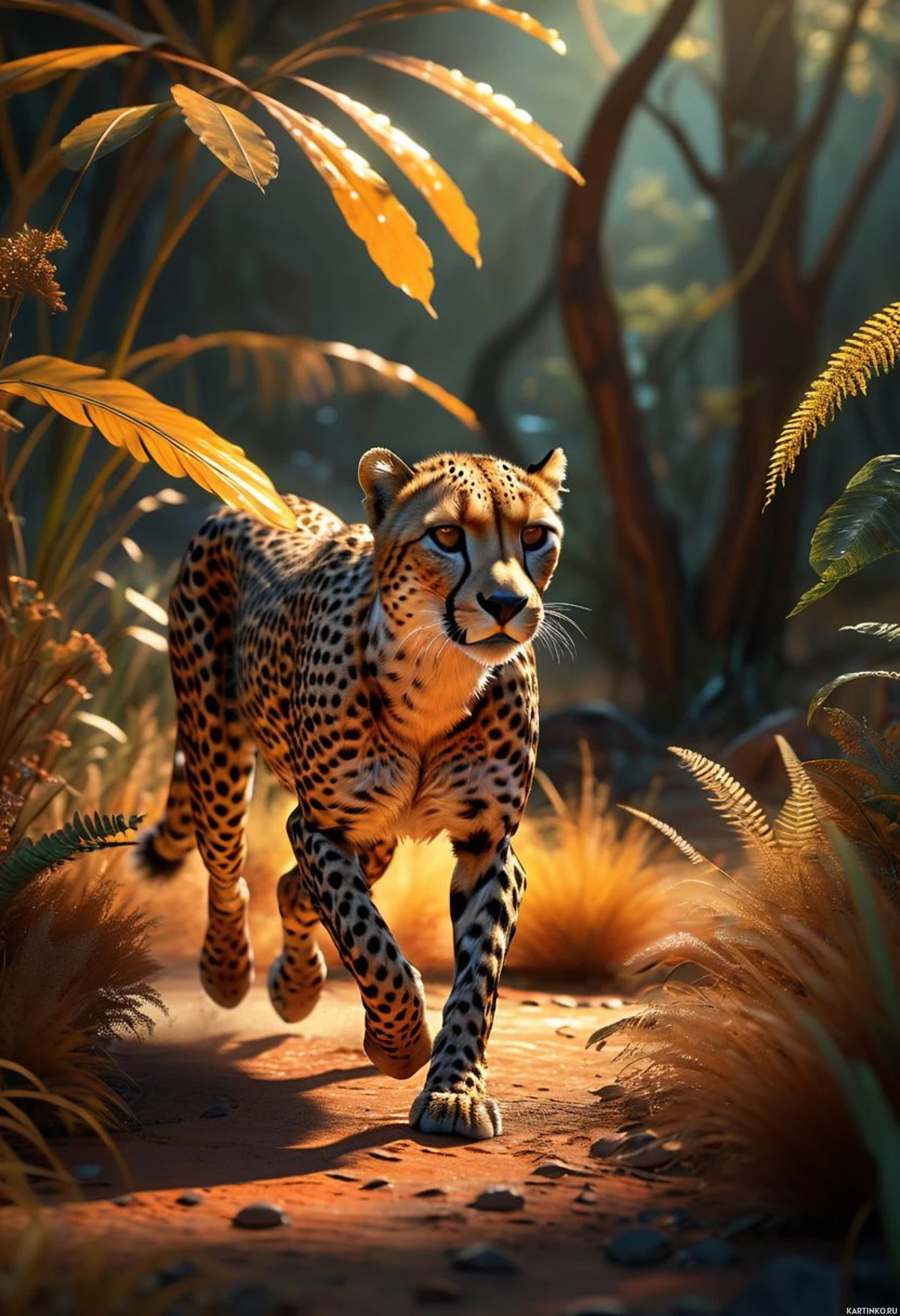 На картинке гепард идет по заколдованному лесу. Земля усыпана камнями и землей, слева – крупный папоротник, а справа – деревья с причудливо изогнутыми стволами. На заднем плане листва сочетает зеленые и коричневые оттенки, создавая ощущение поздней осени или ранней весны. Гепард запечатлен в движении, с повернутой влево головой, словно проявляя настороженность или любопытство к окружающей обстановке. В целом, картинка создает ощущение спокойной и живой природы.