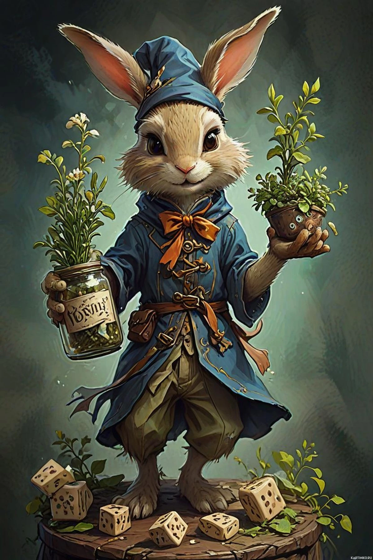 На картинке стоит антропоморфный кролик, одетый в пиратский костюм. На нём синий пиджак с золотой отделкой, коричневые штаны и шляпа с изображением черепа и скрещенных костей. У кролика надеты сапоги, а уши торчат вверх. В каждой руке у него два небольших растения в горшках: в левой – растение с белыми цветами, в правой – зелёное с листьями. Кроме того, кролик держит на коленях, похоже, сундук с сокровищами. На заднем плане – скалистый обрыв, на котором стоит кролик. У подножия обрыва растут растения и кустарники. Общий стиль картинки предполагает, что она из фэнтезийного или мультяшного мира.