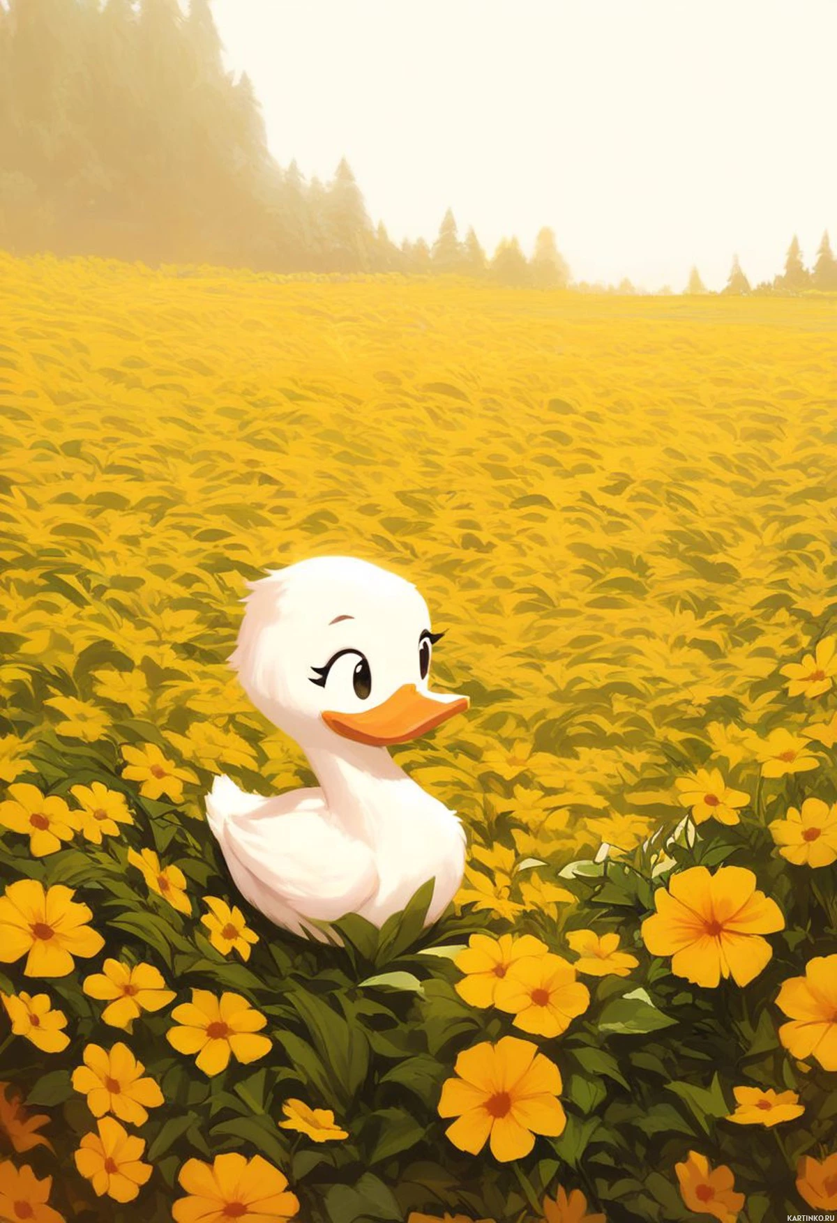 На картинке – стилизованная иллюстрация утки, стоящей посреди поля. Утка будто наделена человеческими чертами: выразительные глаза, слегка приоткрытые губы. Она повернута к зрителю, её тело чуть развёрнуто в сторону от камеры, создавая ощущение непринуждённой позы. Фон заполнен жёлтыми цветами, в основном ромашками, на фоне зелени с деревьями и кустарниками вдалеке под ясным небом.