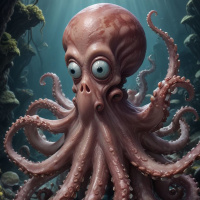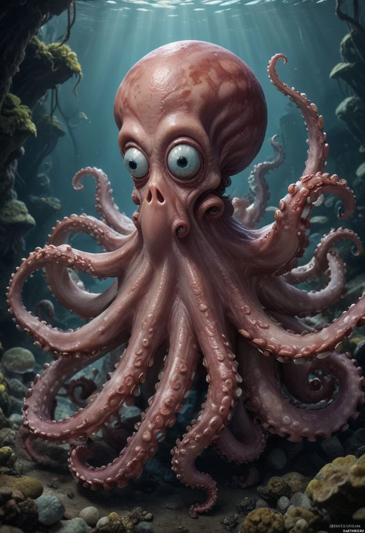 На картинке изображен антропоморфный осьминог, находящийся в подводной сцене. У осьминога удивленное выражение лица: широко раскрытые глаза и разинутый рот. Он стоит на морском дне, окруженный камнями и небольшими растениями. Над осьминогом – проем, через который проникает солнечный свет, создавая неземную атмосферу. Вода над осьминогом насыщенного синего цвета, контрастирующего с более светлыми оттенками внизу, что указывает на глубину. В целом, стиль картинки иллюстративный и яркий, с вниманием к деталям, оживляющим подводный мир.