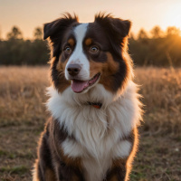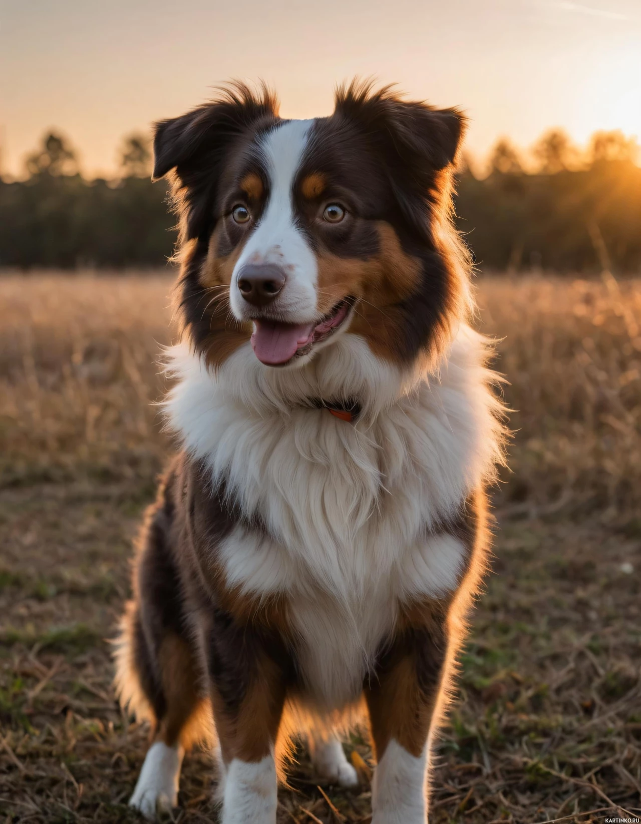 На картинке – австралийская овчарка. У собаки характерная окраска: пятнистая шерсть с сочетанием черного, коричневого и белого. Уши стоячие, глаза янтарного цвета. На переднем плане она сидит на сухой траве, а на заднем фоне закат или восход солнца создает мягкое освещение и отбрасывает длинные тени.