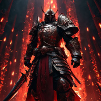 The image features a character that appears to be a fantasy warrior standing in front of an ominous backdrop. The warrior is armored in gold and red, with a visor obscuring the face. They are holding a sword in one hand. There are elements indicative of fire or destruction behind the figure: flames and smoke fill the background, adding to the intense atmosphere of the scene.