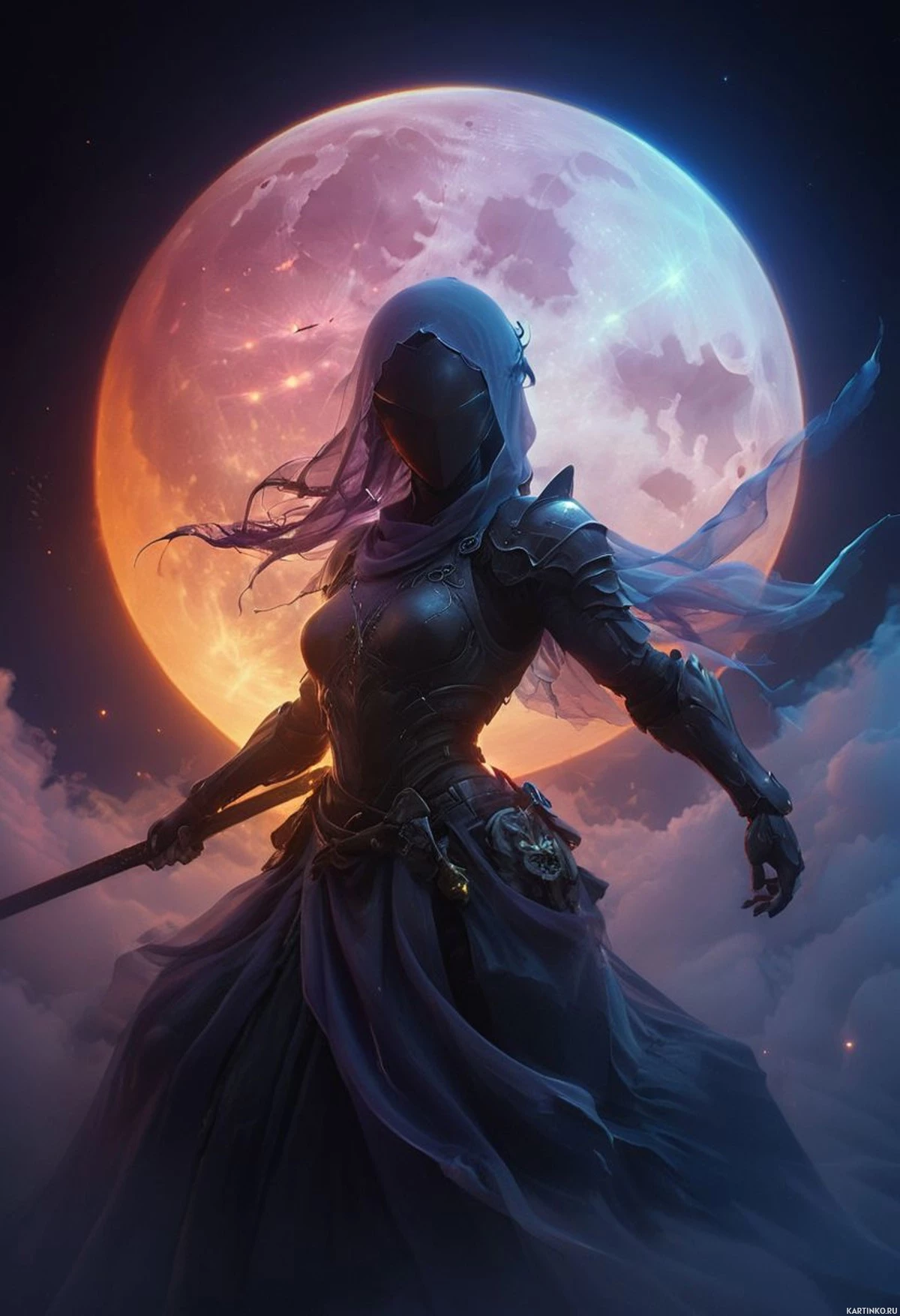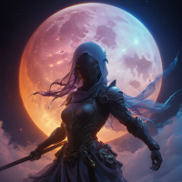 На картинке изображена фигура, стоящая на фоне полной луны, что создает ощущение ночного неба. Персонаж одет в доспехи, что указывает на фэнтезийную или воинственную тематику. Он держит посох и смотрит вдаль. Лунный свет освещает сцену и создает тени, усиливающие ночную атмосферу. Стиль рисунка реалистичен, с акцентом на фэнтезийные элементы, такие как дизайн доспехов и мистическое присутствие полной луны.