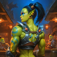 Картинка с героиней фэнтези: у нее зеленая кожа, синие татуировки, мускулистое телосложение. Она стоит перед домиком с горящими фонарями. На одном плече — металлический доспех, волосы завязаны в косу, открывая заостренные уши, как у орка. На заднем плане видны два других персонажа, возможно, гномы, судя по росту, они смотрят на нее из-за бочки.