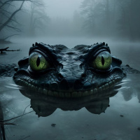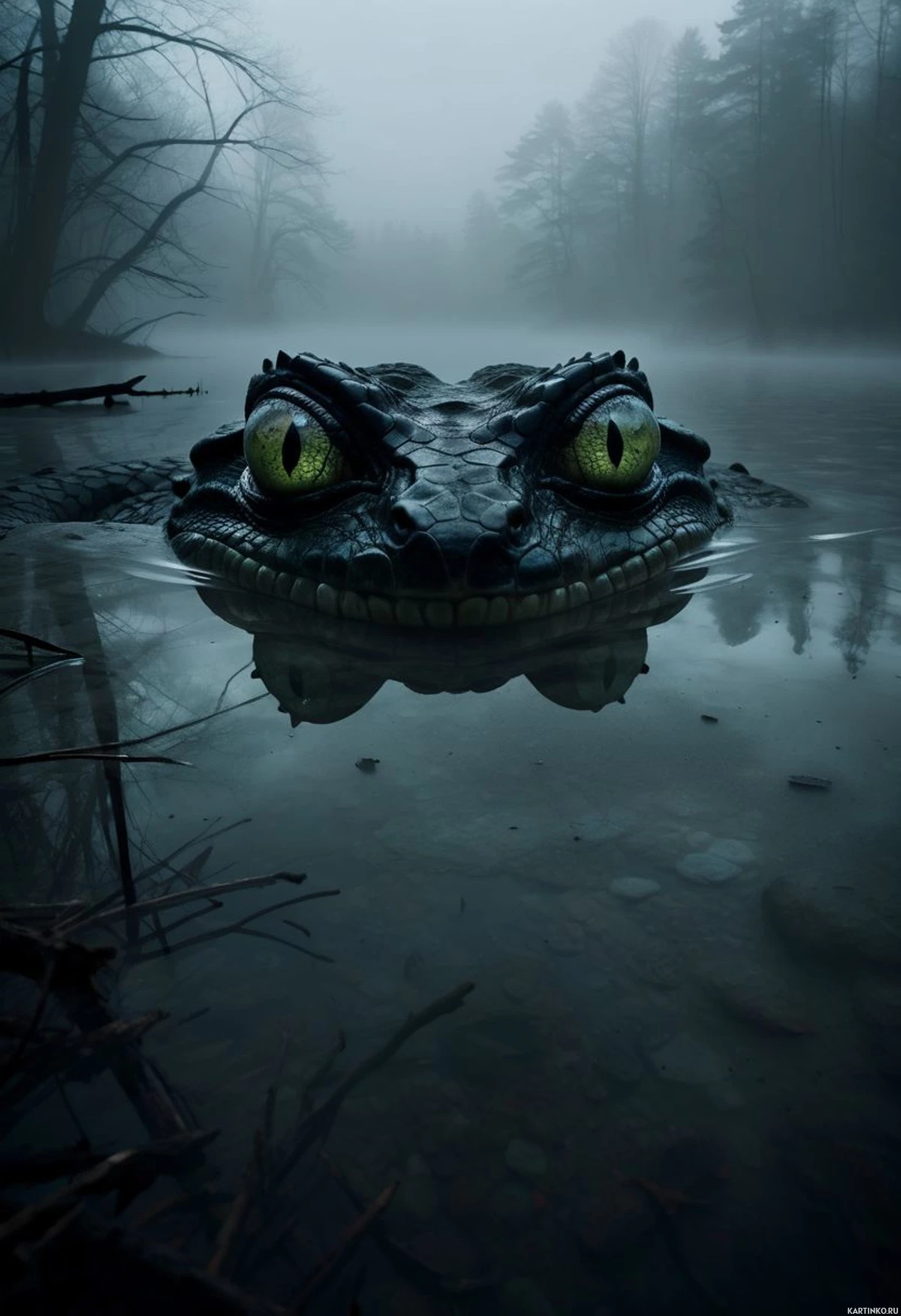 На картинке – крокодил в профиль, показывающийся из воды на сушу. Выражение его морды напряжённое, глаза широко открыты, видны острые зубы. Чешуя текстурная, вокруг тела заметна грязь или ил. На заднем плане – деревья, создающие ощущение леса или болота. Общая атмосфера картинки мрачная и жутковатая, возможно, указывающая на туманную или затянутую дымкой обстановку, судя по призрачному освещению.