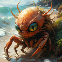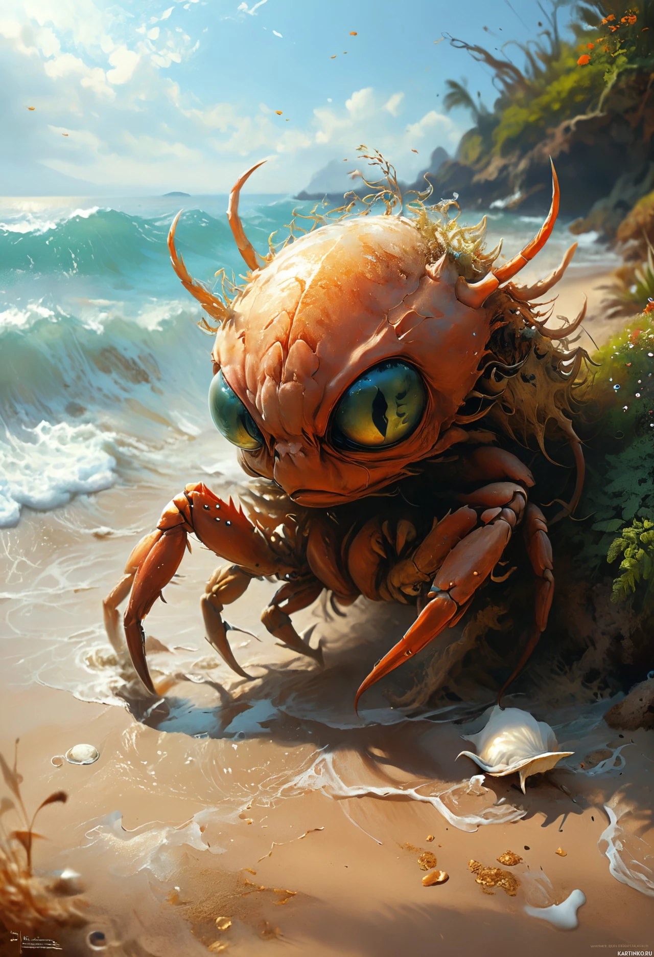 a sandy beach near the water's edge, where small waves are gently lapping at the shore. In front of the creature, there is an opened seashell, possibly discarded by humans or left behind from the natural tide. The creature seems to be observing something in the distance with curiosity, given its