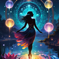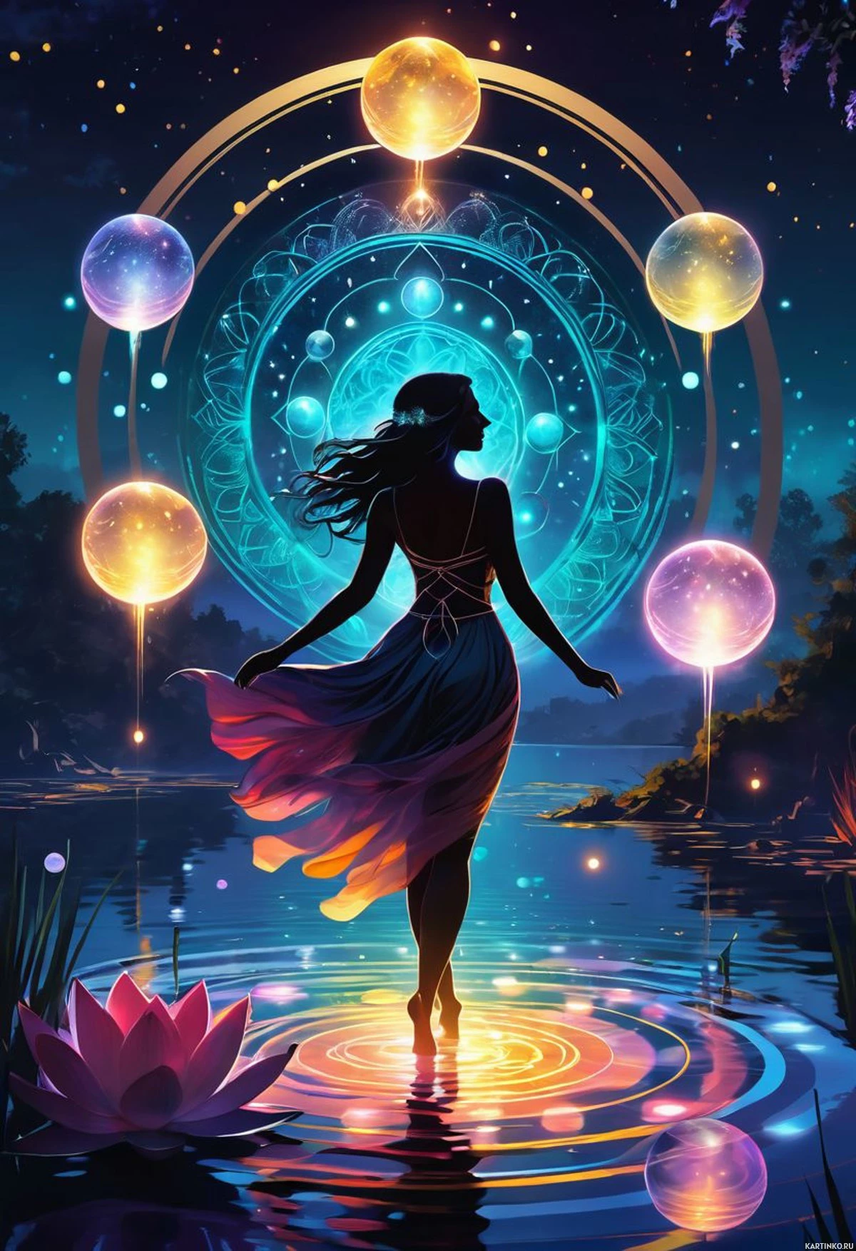 На картинке на переднем плане молодая женщина. На ней длинное платье, и кажется, она танцует, раскинув руки к небесным телам над головой. На заднем плане – ночное небо, полное звезд, планет и полумесяца. Внизу, под этим небесным пейзажем, видна водная гладь, возможно, озеро или река, отражающая свет с неба. Слева на поверхности воды плавает розовый лотос. Общая атмосфера наводит на мысль о духовности и единении с природой.