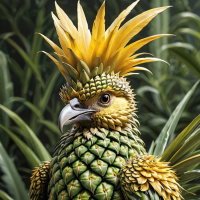 The image depicts a stylized representation of a bird with features reminiscent of a pineapple and a spiked crown, which is characteristic of a quetzal. It is situated within an environment that resembles a natural setting, possibly a forest or jungle given the presence of what appears to be plant life in the background. The bird's body is predominantly green with patches of yellow and spiked feathers along its crown, giving it a striking appearance. Its eyes are open and directed towards the viewer, and it has sharp talons visible on its feet.