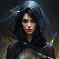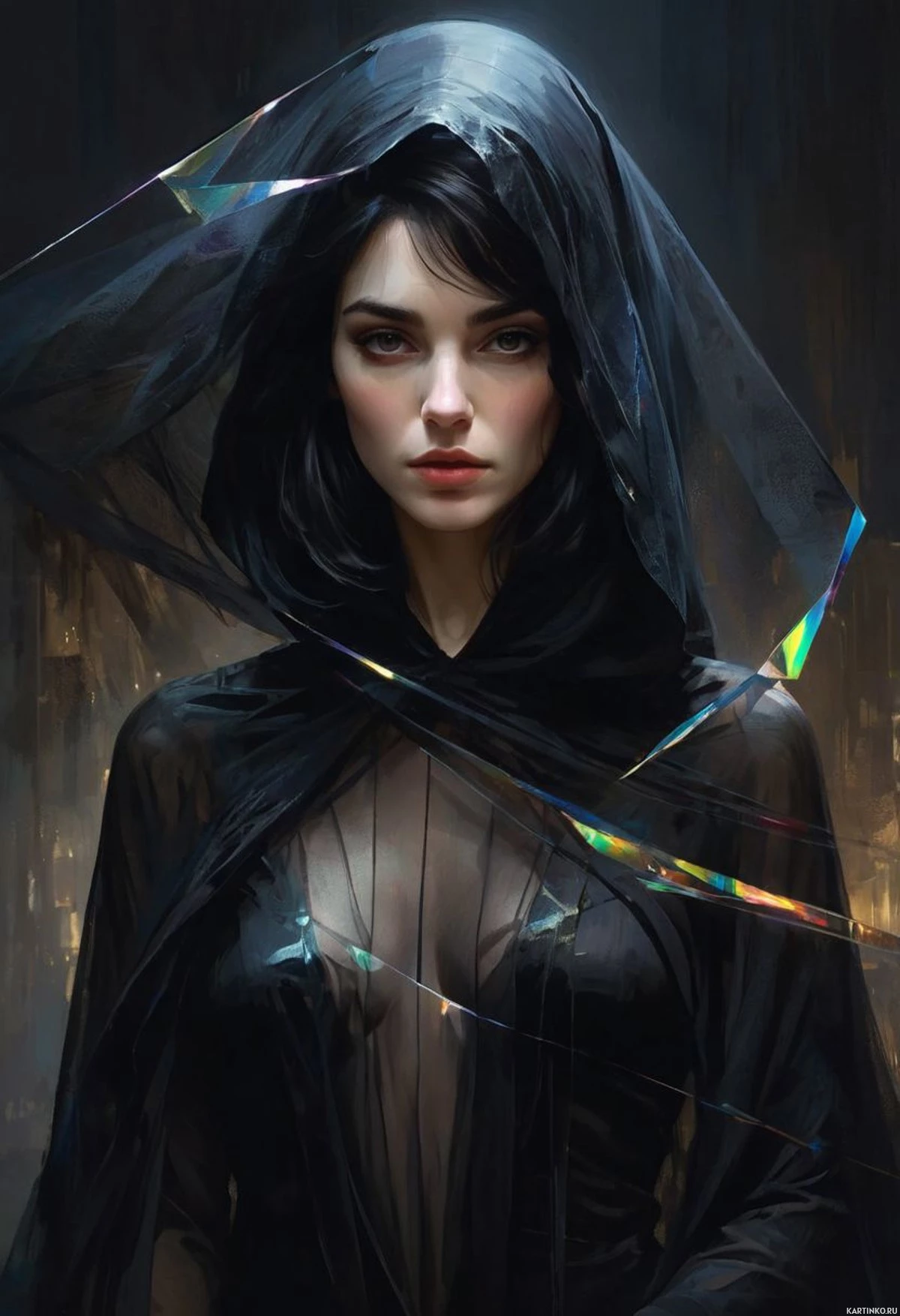 Молодая женщина в черном плаще с капюшоном, украшенном сложной вышивкой, обнажающем плечи и талию. Лицо скрыто под капюшоном, из-под него выбиваются длинные темные волосы. Выражение лица серьезное и напряженное, высокие скулы и слегка приоткрытые губы, словно она сосредоточена или готовится к какому-то действию. На левом предплечье заметна небольшая татуировка или метка, добавляющая изюминку в ее внешний вид.