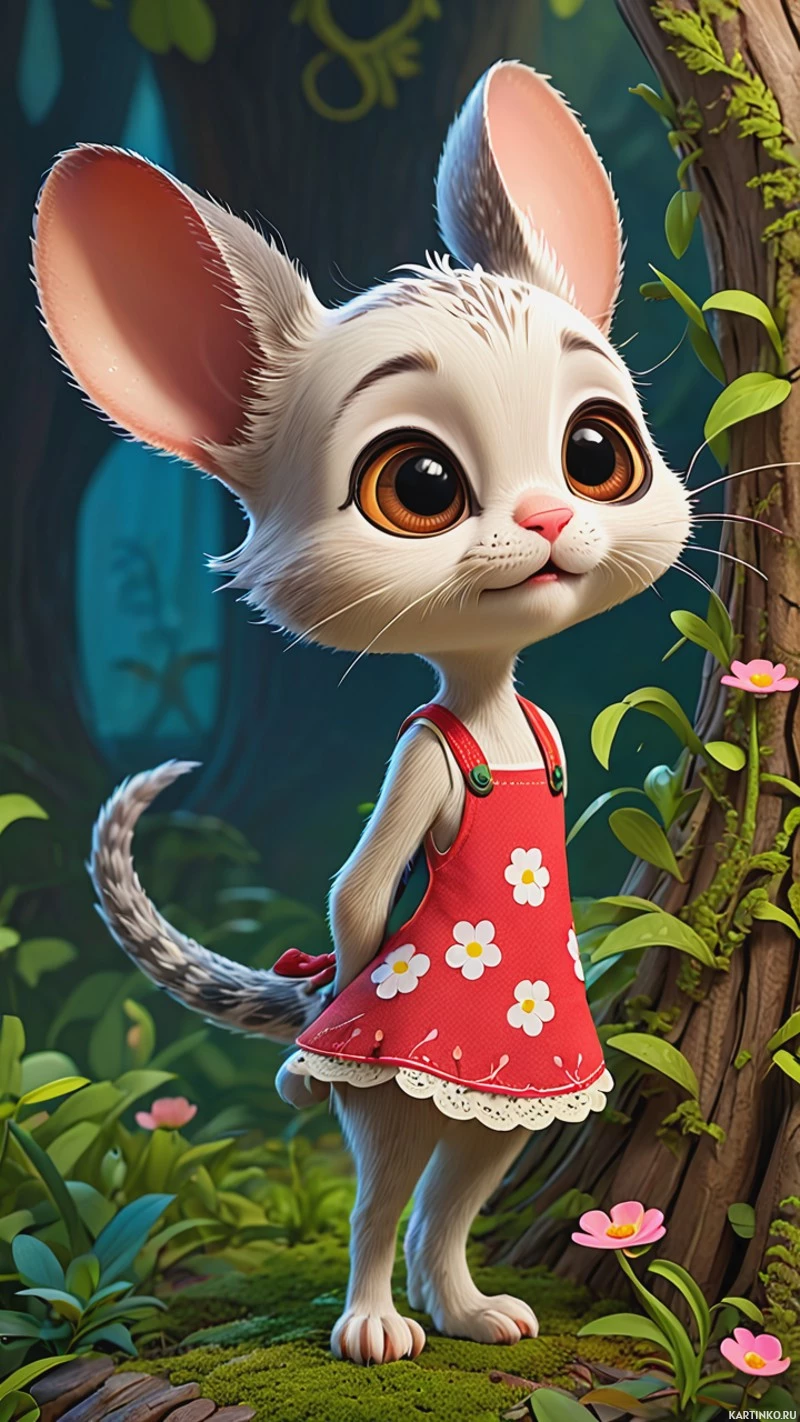 a red dress with floral patterns and is standing on what looks like a leafy branch or plant in a natural setting, possibly a forest given the background elements like trees and foliage. The overall style of the image is stylized and cartoonish, likely from