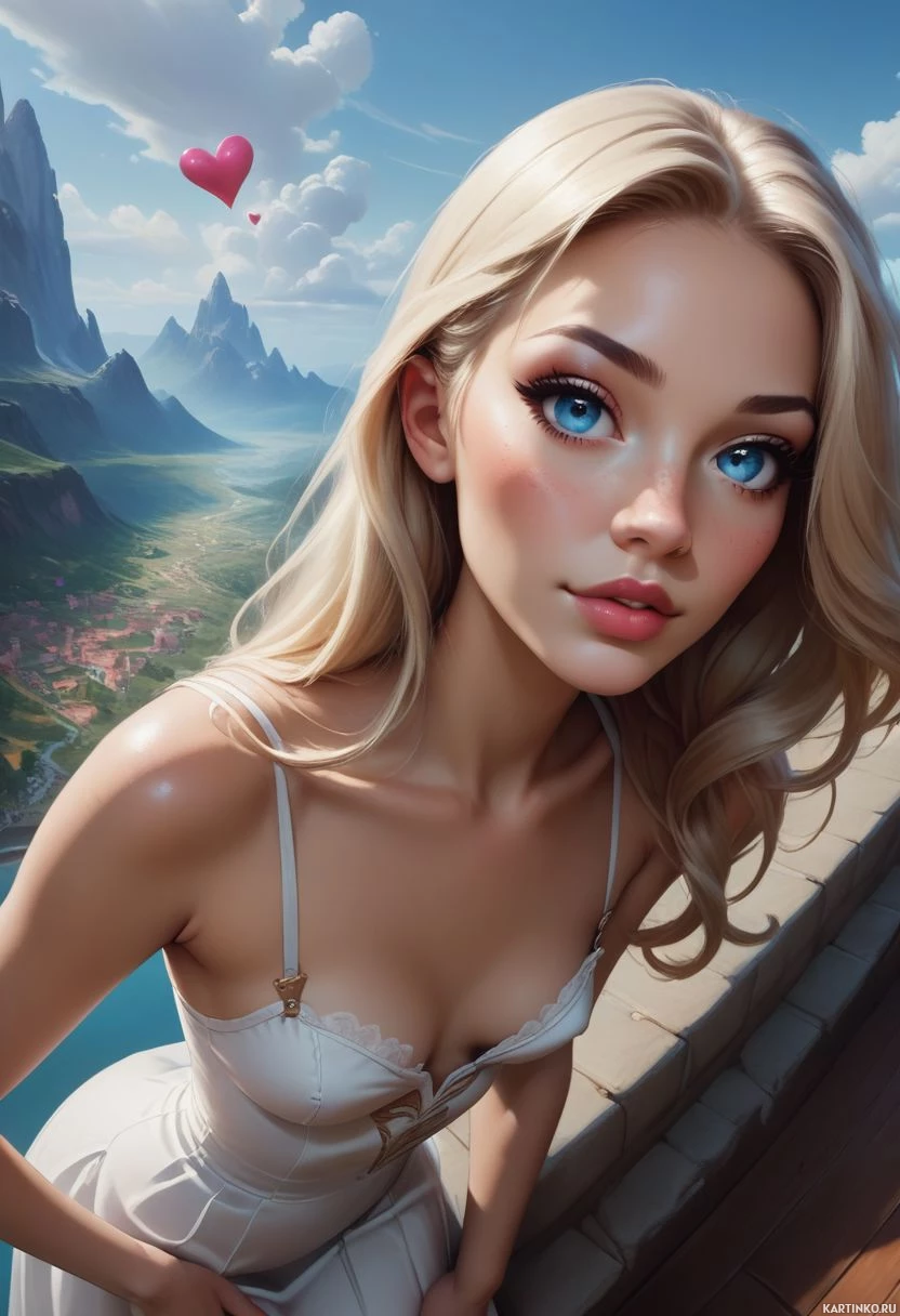 На картинке изображена девушка с волнами золотистых волос, зачесанных набок. У нее светлая кожа и светлые глаза, возможно, голубые или зеленые. Макияж включает подкрученные ресницы и легкую растушевку вокруг глаз, придающую им глубину. На ней светлый наряд с кружевными деталями и лиф в стиле корсет, что указывает на фантазийный или исторический сеттинг. Она опирается левой рукой на бедро, а правая рука согнута в локте и придерживает лицо, что можно интерпретировать как задумчивую позу. Выражение лица нейтральное, но с легкой ноткой меланхолии. На заднем плане — безмятежный пейзаж с зелеными холмами, голубым небом и водоемом, похожим на реку или озеро, создающим ощущение идиллического места.