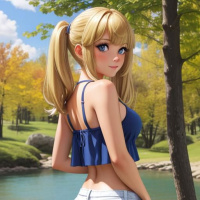 The image features a stylized female character with blonde hair tied back in a ponytail, wearing a blue off-the-shoulder top, denim shorts, and sunglasses. She is standing with one hand on her hip and the other arm behind her back. The setting appears to be an idyllic outdoor environment with trees, a clear sky, and a body of water in the background.
