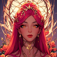 The image shows a stylized depiction of a female character with red hair and what appears to be glowing eyes. She has a fantasy-inspired outfit with intricate gold detailing, suggesting she might be a figure from mythology or a fantasy realm. Surrounding her are elements that add to the mystical atmosphere: roses with green leaves and red flowers, and what seems to be a twig or branch adorned with dew droplets, possibly part of a larger tree or forest motif. The character is set against a dark background with celestial bodies like stars and a crescent moon visible above her head.
