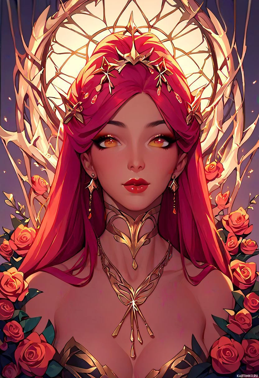 Фэнтезийный персонаж с рыжими волосами, украшенный розами Больше картинок по схожим темам