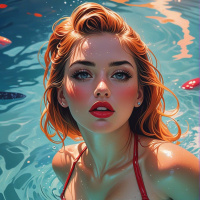 The image features a woman seated in a swimming pool. She has long hair and appears to be wearing makeup with prominent red lipstick. Her attire consists of a red, plastic-like bodysuit. In the water around her, there are several small objects that look like fish or perhaps decorative items. The lighting suggests it might be daytime due to shadows and the reflection on the water's surface.