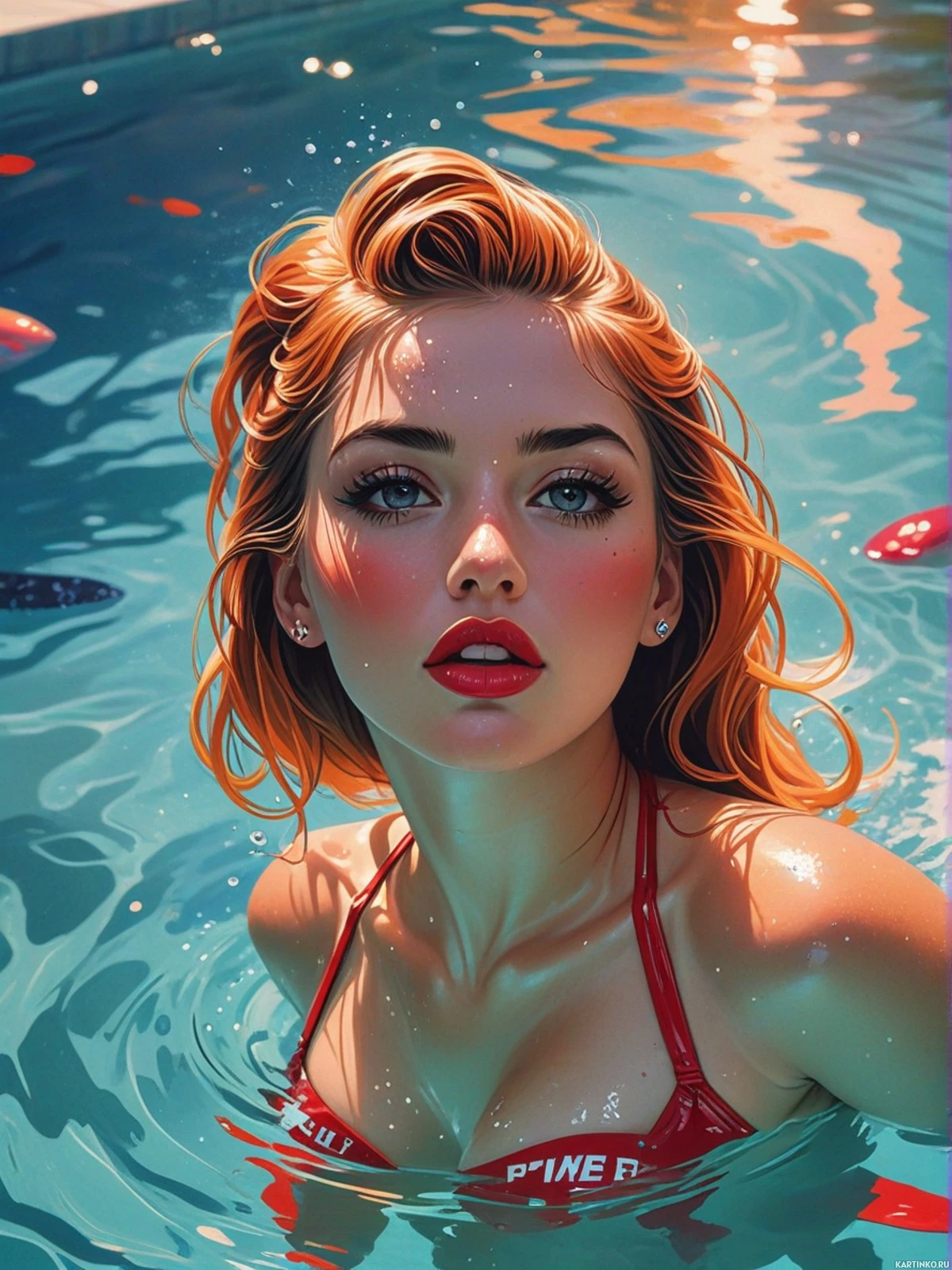 На картинке женщина сидит в бассейне. У неё длинные волосы, видно макияж с яркой красной помадой. На ней облегающий комбинезон из материала, похожего на пластик, красного цвета. В воде вокруг неё плавают небольшие предметы, похожие на рыбок или декоративные элементы. Освещение указывает на то, что это, вероятно, день, судя по теням и отражениям на поверхности воды.