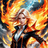 The image features a character depicted as a female with blonde hair and an expression that could be interpreted as stern or intense. She has a fantasy-like appearance, wearing armor that includes red accents and gold details. There is fire surrounding her body, creating a dynamic and fiery background, with flames in various shades of orange and yellow. The character's hands are positioned in a way that suggests action or readiness for combat. The image has a high level of detail and appears to be a piece of digital artwork designed to portray the character as powerful and possibly magical or elemental, given the presence of fire around her.