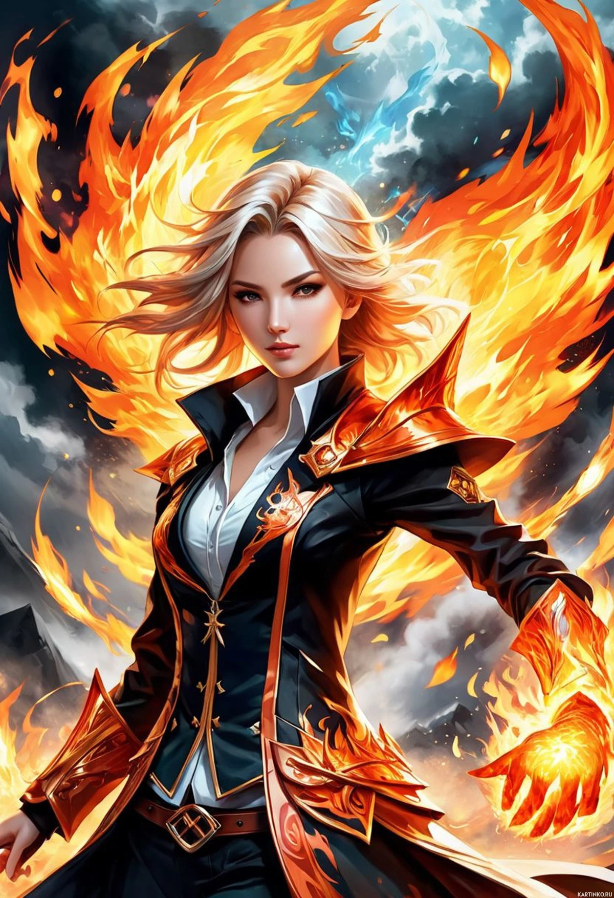 Девушка с светлыми волосами обнимает огненный элемент Картинки с такими же тегами