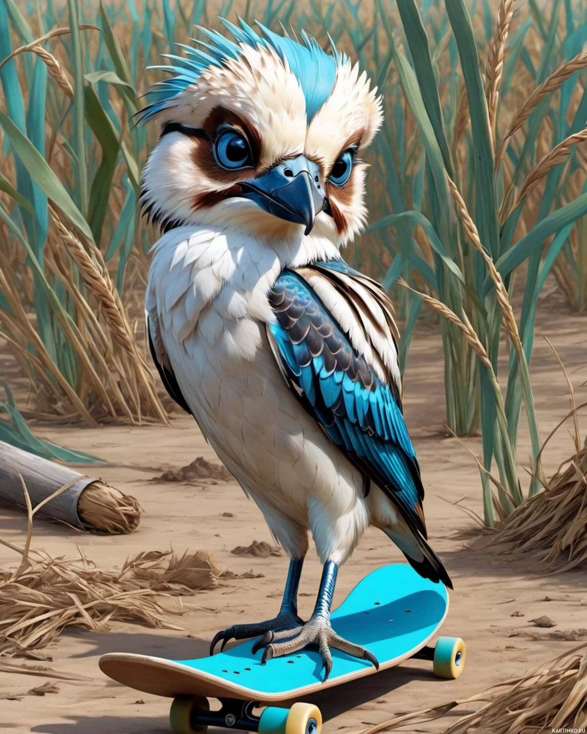 a head shape typical of owls. The owl is depicted standing on a skateboard, which is an object used for riding by humans. The setting appears to be outdoors, possibly resembling