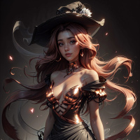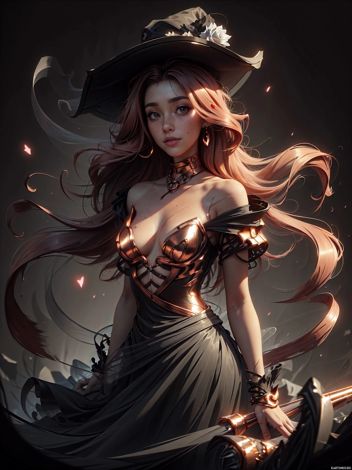 The image features a female figure wearing fantasy attire, including a witch hat and what appears to be armor with gold accents. She has long hair and is holding a staff.