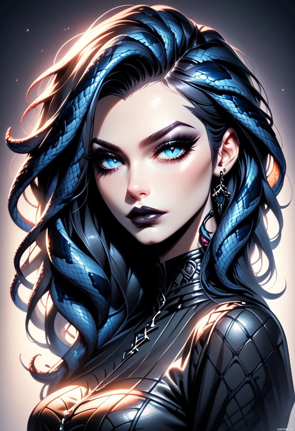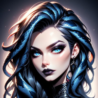Картинка изображает стилизованную женскую фигуру с яркими синими волосами и темной подводкой глаз, придающей ей надменный взгляд. У нее бледная кожа, а на ней облегающий черный наряд, который кажется фактурным или, возможно, сделан из чешуи, что подчеркивает ее дерзкий образ. Поза расслабленная, но уверенная, одна рука нежно покоится на подбородке, намекая на уверенность. Освещение в картинке мягкое, оно выделяет черты лица и создает драматический эффект вокруг головы.