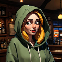 A young woman wearing a green hoodie stands at a bar counter. She has blonde hair and is looking towards the camera with a slight smile. Behind her, there are shelves stocked with bottles that appear to be alcohol. On the counter in front of her is a large plate containing what looks like a freshly baked pastry, possibly a cake or a type of bread. There is also a glass of amber-colored liquid next to the plate, which could be beer. The setting suggests an indoor bar environment with warm lighting and rustic decor elements.