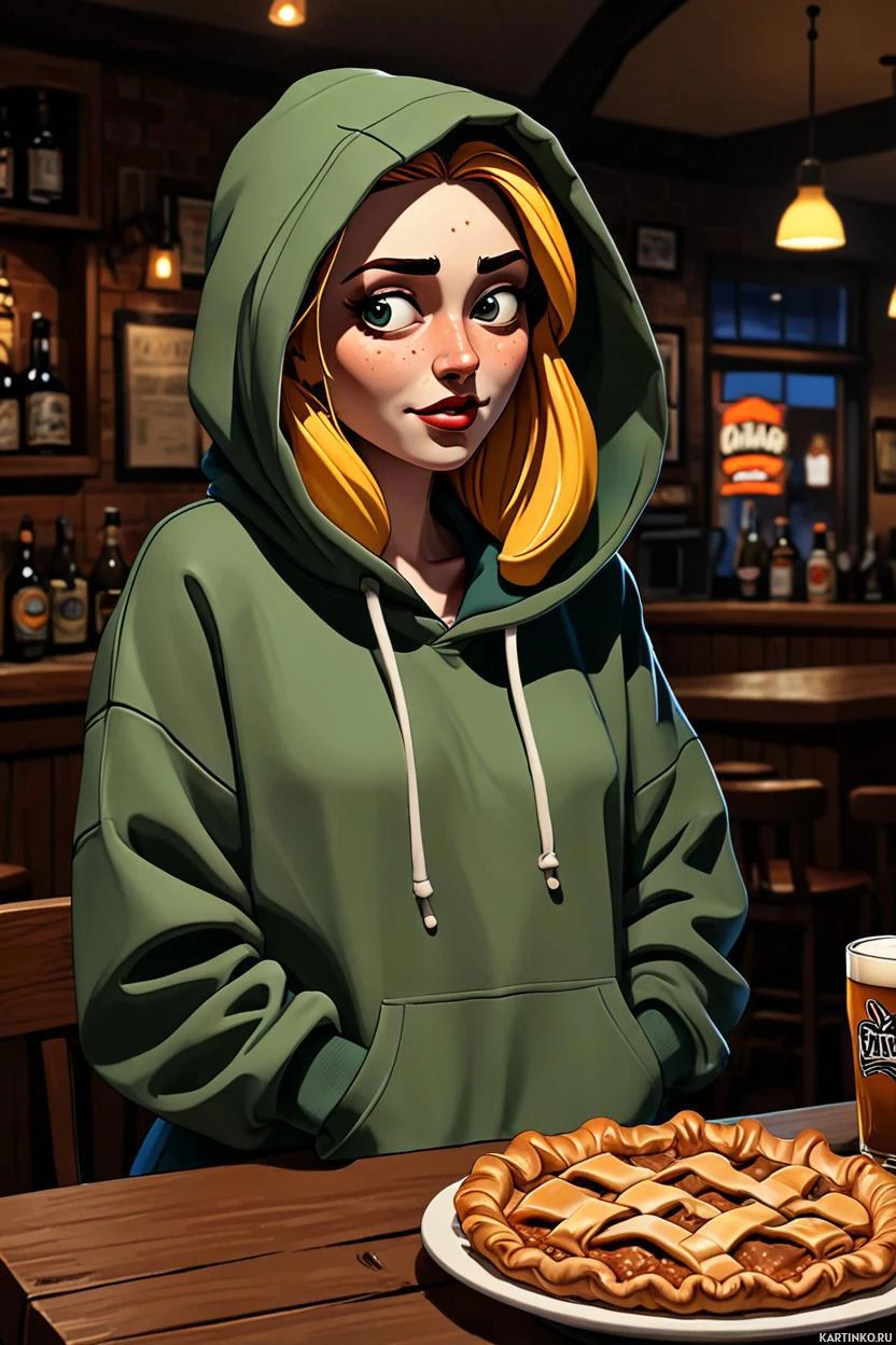 Молодая женщина в зеленом худи стоит у барной стойки. У нее светлые волосы, и она смотрит в камеру с легкой улыбкой. За ней видны полки, заполненные бутылками, вероятно, алкогольными напитками. На стойке перед ней большая тарелка со свежеиспеченным десертом, возможно, тортом или хлебом. Рядом с тарелкой стоит бокал янтарного напитка, который может быть пивом. Обстановка предполагает интерьер бара с теплым освещением и элементами деревенского декора.