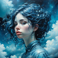 The image depicts a digital artwork of a girl with blue hair and striking blue eyes. She has long, dark eyelashes and a fair complexion. Her hairstyle is somewhat messy, suggesting movement or the wind. The girl is wearing a sleeveless top that appears to be made of leather or a similar material, adorned with tiny stars or embellishments along the collar. She stands against a backdrop that features dark blue clouds and shades of black and white, contributing to a somewhat ethereal or celestial atmosphere. The lighting highlights her face, drawing attention to her gaze which is directed slightly downwards and to the left of the frame.