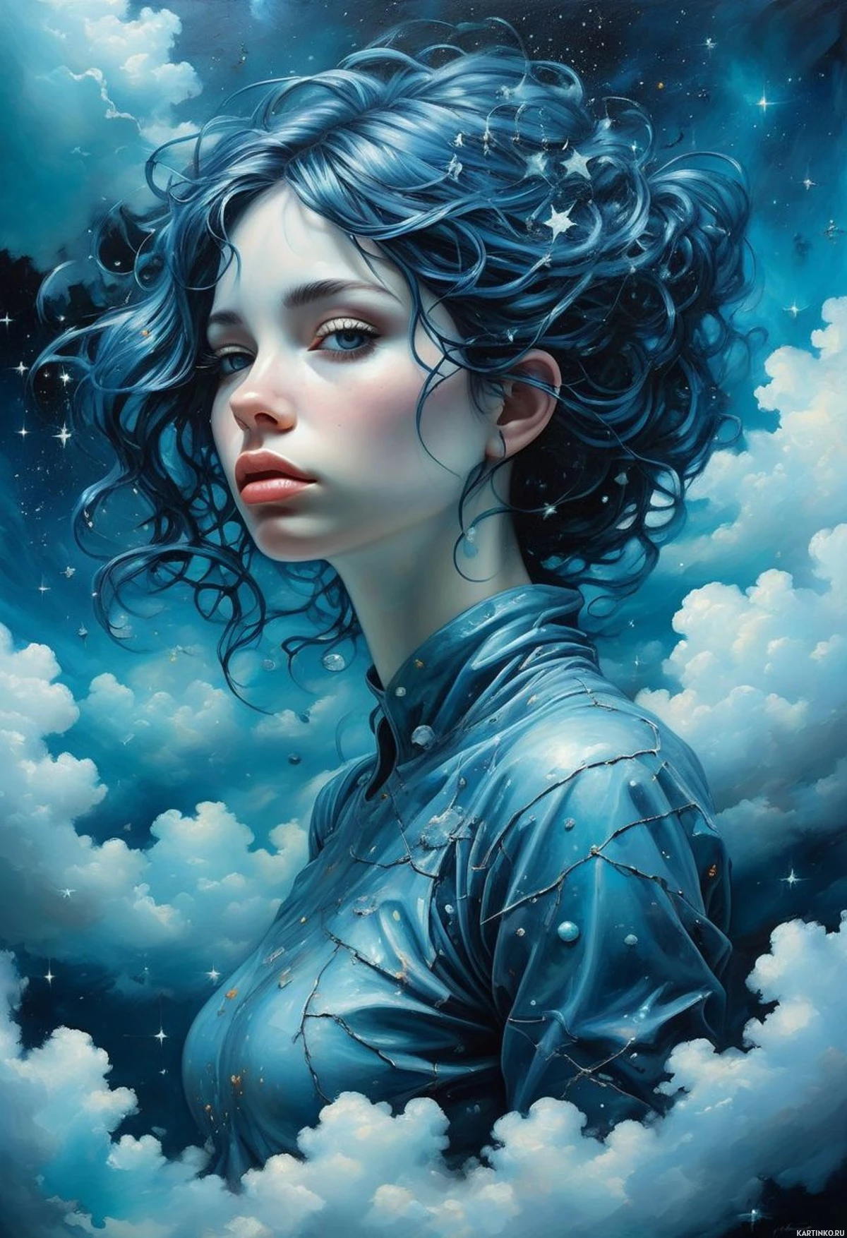 На картинке – цифровая иллюстрация девушки с голубыми волосами и выразительными голубыми глазами. У неё длинные, тёмные ресницы и светлый оттенок кожи. Её причёска немного растрёпана, словно от ветра. Девушка одета в топ без рукавов, который выглядит как кожа или похожий материал, украшенный мелкими звёздочками или декоративными элементами у воротника. На заднем плане – тёмно-синие облака и оттенки чёрного и белого, создающие немного неземную, небесную атмосферу. Освещение выделяет её лицо, привлекая внимание к взгляду, направленному немного вниз и влево от кадра.